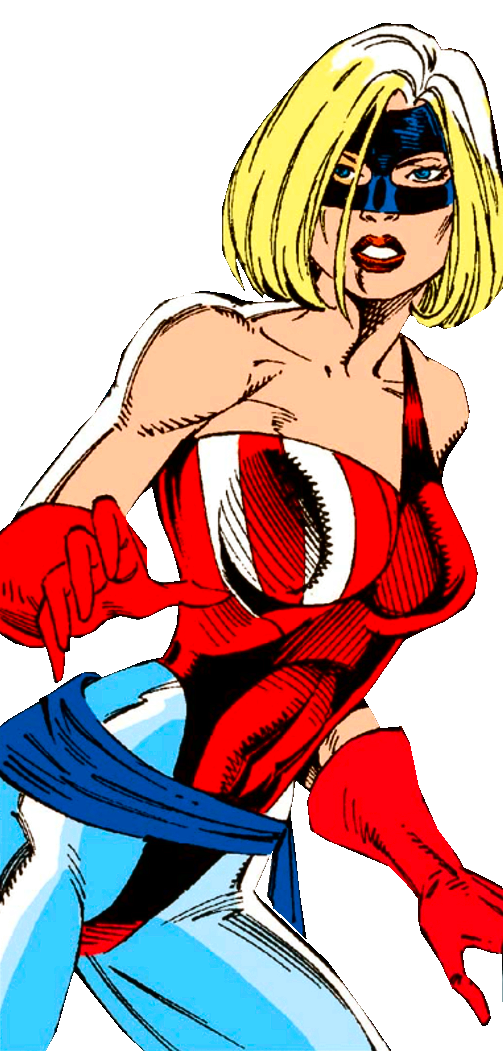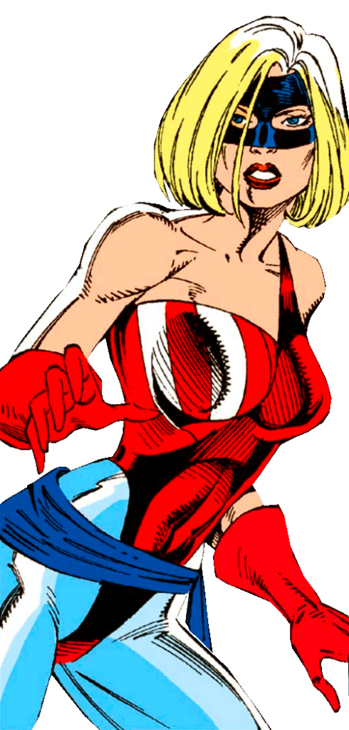 • FREE SPIRIT – Having been transformed into an athletic dynamo by one of Captain America’s enemies (in CAPTAIN AMERICA #431), 19-year-old Cathy Webster is a driven young woman who is the most idealistic — and mature – member of the team. By the time NWV2 starts up, Free Spirit is majoring in Political Science at Columbia University. Even though she’s no longer partnered with Cap (or her fellow protégé, Jack Flag), she still puts in a lot of hours as a super-hero, righting what wrongs she can. She learned to be independent when Cap was thought dead during the Onslaught affair, and even though she feels that she owes her crimefighting career to him, she’s comfortable working on her own. As the new team gets under way, she finds herself in the curious role of unofficial leader, as the other members find themselves looking to her level head and shrewd strategies, both in the field and in private matters. She’s initially put off by the arrogant and crude mannerisms of Legacy, but in time she begins to harbor a rather strong attraction to the rugged young hero. Shortly after the formation of the team, Free Spirit decides to get an off-campus apartment with Ultra Girl, and the two form a fast friendship. What no one knows about Free Spirit, however, is that shortly after the NW reform, she’s recruited by the Commission on Superhuman Activities to act as a spy, making routine reports to them on the NW’s adventures. While a part of her feels traitorous, another part of her feels as if she’s being a good patriot, by doing what her country asks of her.
