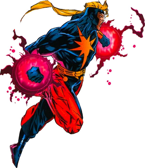 • LEGACY – Powered by his father’s Nega Bands, Genis-Vell comes crashing down to Earth in an attempt to escape Gladiator, who considers him an enemy of the Shi’ar Empire. It’s this event that serves as the catalyst for the origin of the new NW, as our various young heroes rally together to fend off the advances of Legacy’s pursuers. In the aftermath, Legacy feels less like a hero than ever. He was never really sure he had what it takes, but in the wake of his mother’s murder (in the WARLOCK Limited Series), he truly feels like a failure. But meeting these other young heroes, some of whom share both his doubts and aspirations, feels right tohim – and he easily makes the decision to join them. Because of his feelings of inadequacy, Legacy relinquishes the “Captain Marvel” title until he feels he’s truly earned it. Having a teammate named Marvel Boy proves to be comically frustrating, however, as people continually think Marvel Boy is Mar-Vell’s son! All the self-doubt in the world can’t wash away Legacy’s machismo, however, and before too long he’s back to his swaggering, headstrong self. This trait is a source of great friction in the team, as Legacy continually butts heads with the other team members over all sorts of issues – chiefly, the meaning of “justice.” As an alien, Legacy doesn’t really have any respect for Earth’s laws, so he tends to view “justice in a more pure, unhampered way.