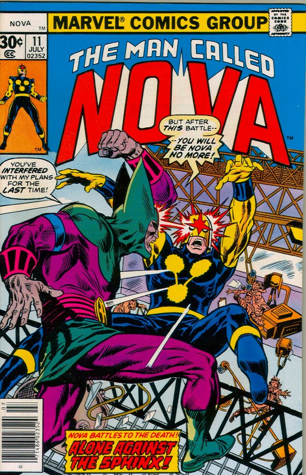 Sphinx appears before Nova claiming he has come to uncover “the key” within Nova’s mind. Nova tries a full fledged punch which does not even phase Sphinx. Sphinx returns the favor by punch Nova into some cables which send volts of electricity through him. Before he can recover, Sphinx picks him up and tosses him into a wall. Then breaks off a metallic unit and brings it down over Nova’s head. Nova rises again, only to be zapped by the Ka Stone on Sphinx’s head. Still he rises, so Sphinx brings down tons of metal onto Nova. And yet again, he rises and lunges for Sphinx. Sphinx admits he can’t take what he needs from Nova; and admits at being wrong about another thing. He had called Nova a child; and tonight he proved, if anything, that Nova is a man!