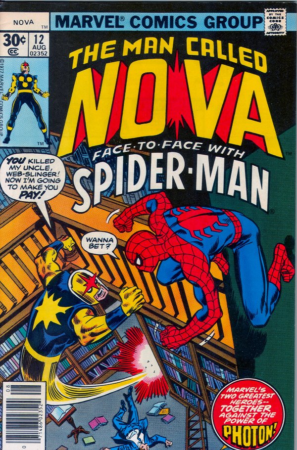 It’s at that moment that Richard Rider walks in with the intention of asking the police if he can use their phone. Richard goes with the police chief and Jason Dean to his uncle’s house, fearing for the worse. They find Harry Daze (ironically dazed) who tells them that Photon had gone in a specific direction. Entering the room, they find Rich’s uncle face down with Peter Parker standing there. Rich jumps at Peter Parker and begins hitting him, claiming that he is the murderer. Peter Parker explains that Doctor Conners had sent Peter here to check out his physics library when Photon arrived and rendered Peter unconscious. Both Rich and Parker excuse themselves and don on their super hero identities. Spider Man comes across Michael Lincoln who manages to hit Spider Man with more speed and strength than Spider Man had guessed. Nova flies by and sees the fight below – recalling how the Daily Bugle had always painted Spider Man a villain, he strikes from the back. Spider Man in turn webs Nova’s visor. Nova grabs Spider Man by the wrist and takes off into the air, only to have Spider Man kick Nova in the face. Spider Man explains what he was doing and Nova apologizes, explaining he was new to the whole hero business. Nova grabs Michael Lincoln and together they bring him back to Nova’s uncle’s place. They walk in on the chief of police, James Steele, asking questions of Franklin Risk. < BR>