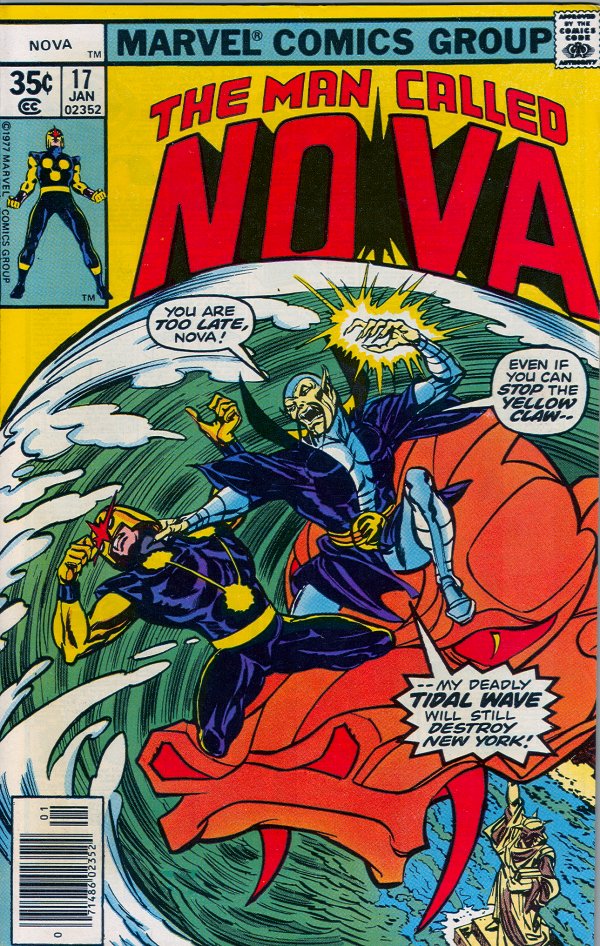 Just a few moments later, Nova and Fury manages to sneak into the underwater base of Yellowclaw. Just as they reach Yellowclaw he unleashes the tidal wave – Nova realizes that he now has a new priority – stopping the wave. However, his best efforts prove to do very little. Fury shows up with a number of ships to attempt to blast the wave and disperse its raging power. He tells Nova to go after Yellowclaw again. Chasing Yellowclaw he manages to catch up – but rather than fight, Yellowclaw asks that Nova hear him out first… all the while holding his Psychogun behind his back!