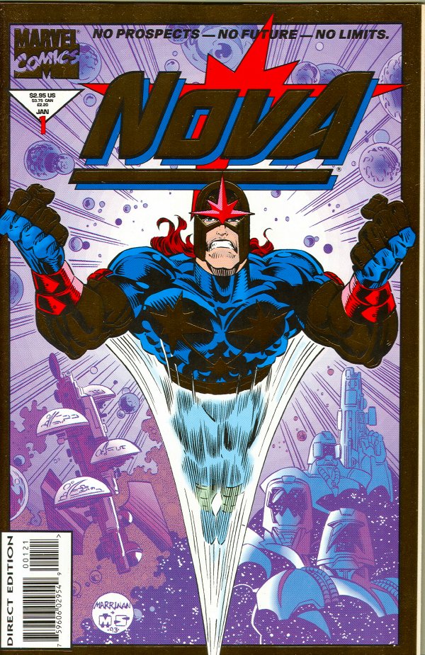 The three Shi’ar then begin to listen to and watch the holographic projection of the Nova Prime’s history – beginning with Centurion Nova-Prime, Rhomann Dey’s approach to Earth, after battling Warlord Zorr. The holographic projection goes on to show Richard Rider randomly obtaining the powers of Nova, from Rhomman Dey. It also goes on to describe Richard’s battles with the likes of Diamondhead, Condor and Powerhouse as well as his epic battle against Sphinx. It also goes on to say how Richard Rider gave up those powers, rather than remain on Xandar, and returned home. However, having had his powers for a year, he found that he had missed much in life – including his education. And when everyone else moved on, Richard Rider did not. His life had become one that seemed to lead into only trivial changes – including life at a fast food restaurant. That life, however, was quickly changed one day when an individual by the name of Dwayne Taylor, better known as Night Thrasher, threw Richard Rider from a high roof, banking on the fact that his Nova powers would activate again. He had assumed correctly. Richard Rider adopted the name Nova once more, but had no obligations to Xandar, as it had supposedly been destroyed by the space pirate, claiming to be the daughter of the mad Thanos – Nebula.