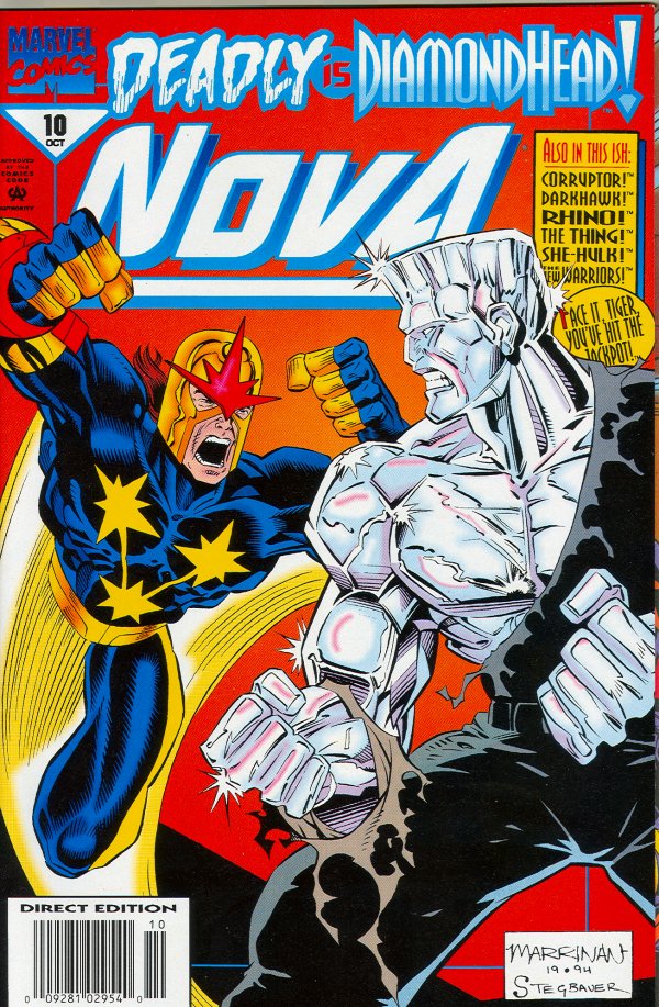 Nova and Diamondhead collide, each of them trading punches. Nova threatens to have Diamondhead tried for treason, since Diamondhead threw in with the enemy, which cost the Xandarians countless lives. Diamondhead manages to give Nova pause by mentioning Epyrus-7 which triggers memories of a war against Skrulls within Rich’s mind. He recalls being there, seeing the pain, so many Centurions killed. He remembers seeing Diamondhead, reveling in the senseless savagery of war – and then a female figure – one he can’t make out. Diamondhead capitalizes and punches Nova away; Nova gives chance and runs into Rhino. Rhino, in turn, knocks him into the air; by the time Rhino flies back, Nova’s surprised to see that Darkhawk has already taken care of Rhino; but Diamondhead has gotten away.