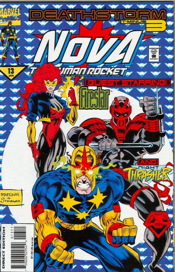 Nova explains that he’s somehow tied to this whole Deathstorm thing, which Night Thrasher shrugs off, saying that such a leap of logic is impossible to make. Night Thrasher and Nova seem about ready to exchange punches, when Firestar breaks up the fight. Just then Fury drops in with a signal informing them that they have uncovered the Shadow Consortium – or at least one of their bases, and sends Nova, Night Thrasher and Firestar to check it out. Things initially start smoothly, but Nova proves to be too eager to settle matters and simply breaks into their communication area.