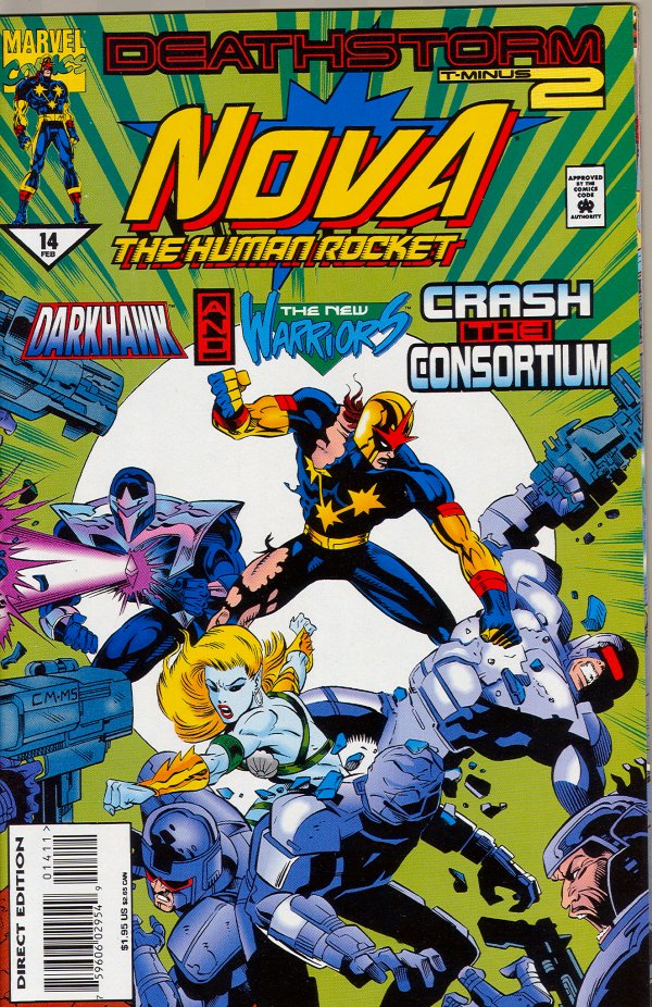 They spot an old factory, where suddenly, with no warning, armored men come flying out, blasting at Namorita and Nova. Firestar and Justice handle the Stinger Missiles fired at the helicopter, while Darkhawk, Turbo and Speedball leap out and join the fighting down below.