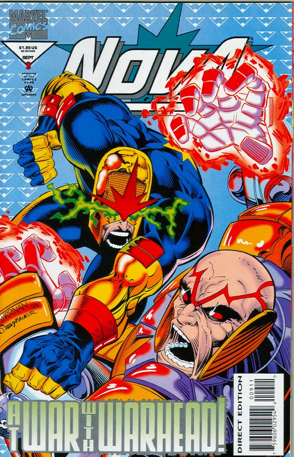 However, as they struggle to regain control of the ship, Warhead bursts through the ship, glowing. Nova and Warhead lock into combat, seemingly evenly matched, causing more destruction to the ship, which has gone into a nose dive, than to one another. Nova hits him with another blast from the eyes, which finally overloads Warhead. Warhead reveals that Nova is responsible for the death of his brother; Nova offers to help Warhead off the ship, regardless; but Warhead refuses. Grabbing Bernie and Caps, Nova flies them off the ship only moments before impact.