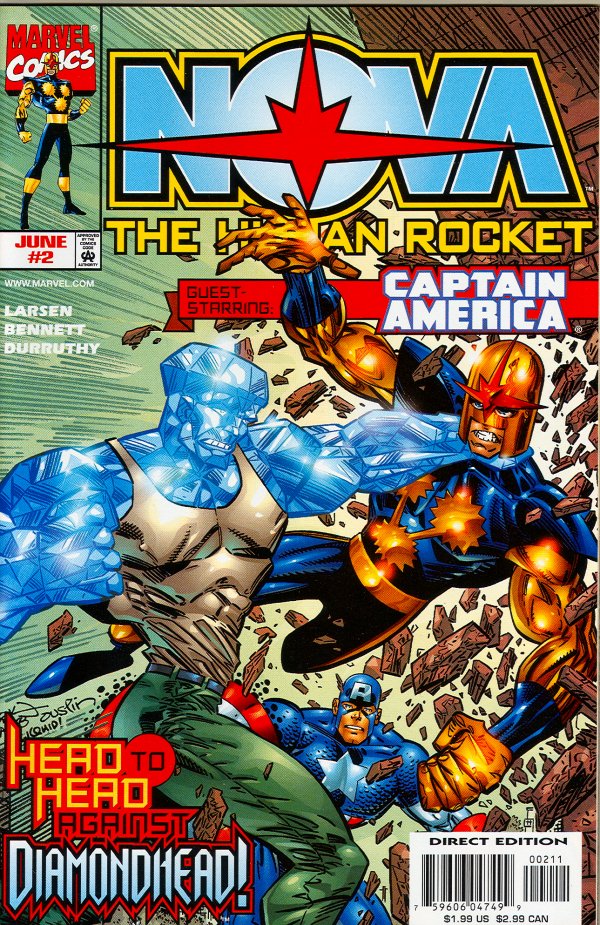 Rich bumps into Diamondhead in the hospital. Diamondhead has been paid to “make a doctor pay” for taking the lives of unborn children by performing abortions. Rich dons on the Nova outfit. Nova grabs Diamondhead and flies him through a wall to get him out of the area where innocent civilians could get hurt. Diamondhead looks at Nova and says, “I still haven’t forgotten Epurus-7.” That phrase stops Nova again; once more allowing Diamondhead the chance he needs to pound the stunned Nova. The memories come back – he remembers Diamondhead using chemical weapons against both sides, during a war – forcing Nova to use a Nova blast to end everyone’s misery.