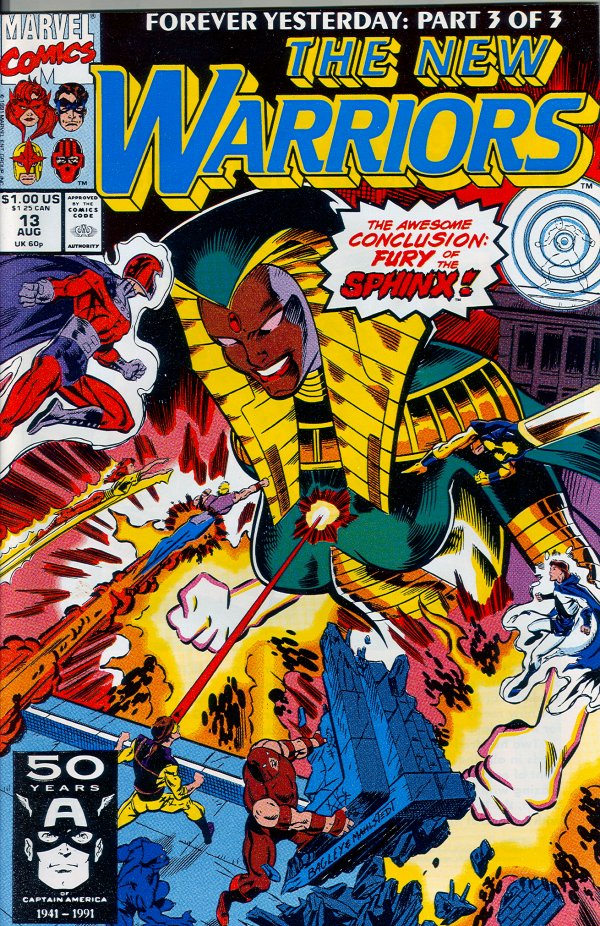 Sayge informs Marvel Man, Firestar and Nova that they must go to the Chrysler Building... and that is where Sphinx will be defeated... meanwhile, within the Chrysler Building... Night Thrasher finds himself under attack by an energy projection of Lady Sphinx... Pulling Night Thrasher out of the way just before a fatal blast finds its mark, Marvel Man and Firestar move in and begin blasting the energy projection of Lady Sphinx...