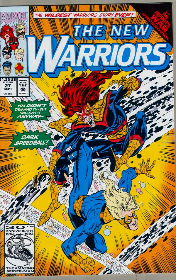 This issue opens up with a rather comedic view. We see Speedball bouncing through town, trying to maintain control of about seventeen pizzas! However, just when he seems to be in control, right where he's gonna land, a police car smashes into the ground. The pizza splashes everywhere and Speedball bounces into the alley where the police car was thrown from only to find... Rage fighting... Rage!