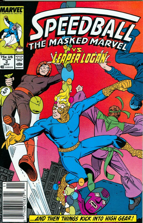Speedball guesses right as Leaper Logan suddenly appears; but is tackled by Speedball. Leaper Logan scales a wall but Speedball is right behind him; Leaper knocks Speedball off, and this time Speedball uses his momentum to bounce from the floor, back up and above Leaper Logan, so he could use his weight to bring Leaper Logan off the wall. The two bounce and tumble around, until Speedball drops him off in front of some very stunned police officers.