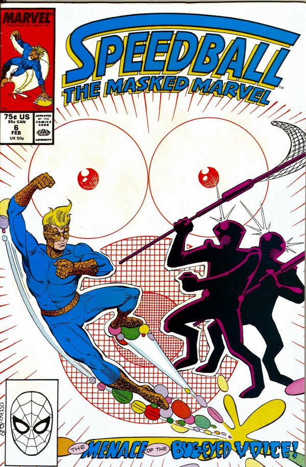 Bug Eyed Voice is seen moving outside in the shadows. When the historical coins arrive, Bug Eyed Voice makes his move. He orders everyone into the back and locks the room. Fortunately, Speedball was not there and comes bouncing in. Bug Eyed Voice knocks him away and Speedball grabs a chord to try and gain control of his bouncing; he pulls the live wire which strikes Bug Eyed Voice’s metallic helm, shorting it out. Bug Eyed Voice makes a break for it but is captured by local authorities outside.